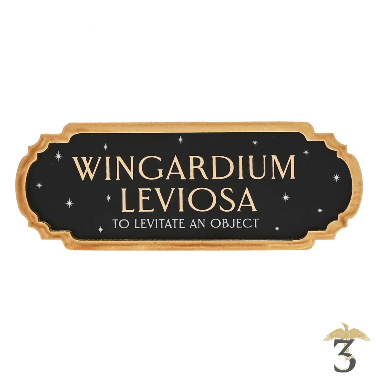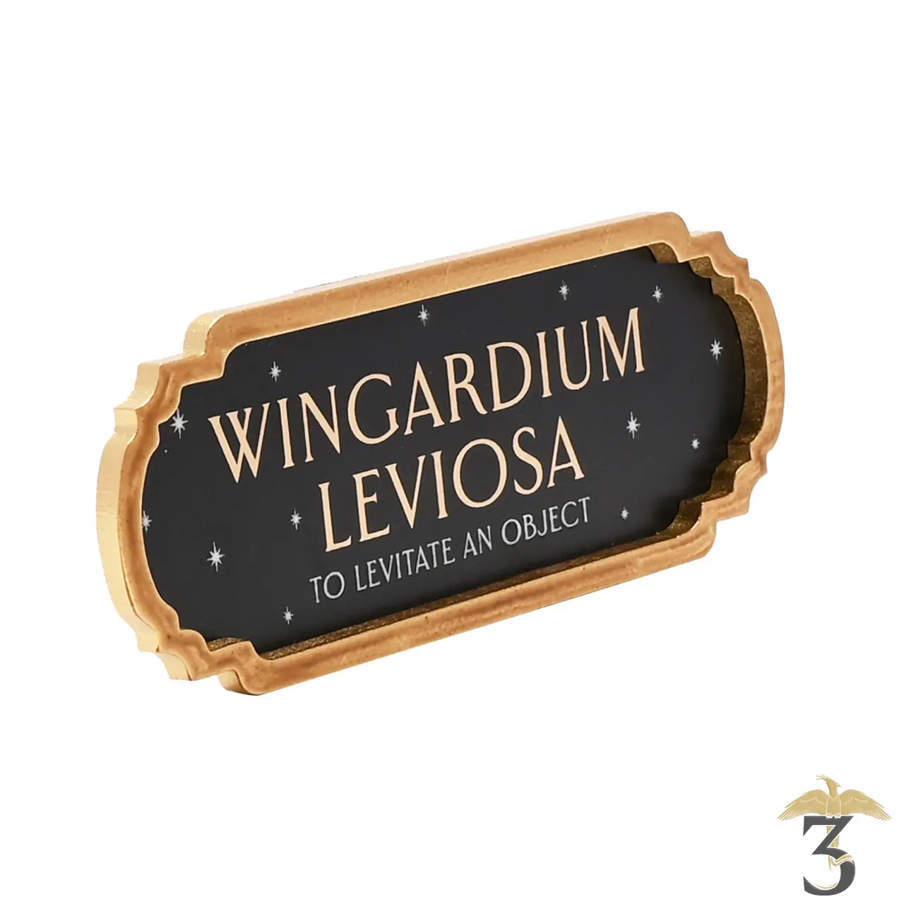 Le panneau en étain noir présente un design étoilé « qui brille dans le noir », avec le titre doré « Wingardium Leviosa », le libellé blanc « To Levitate An Object » – qui brille également dans le noir – et une finition à effet métallique. Il est complété par une bordure en bois doré et un crochet pour affichage mural.